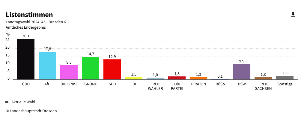 Auch wenn es bei mir nicht für den Landtagseinzug gereicht hat: Ich möchte mich bei allen Wählerinnen und Wählern in der Dresdner Altstadt, Pieschen, Strehlen und der Friedrichstadt für ein sehr ordentliches Ergebnis – 10,2 Prozent der Erststimmen, 12,9 Prozent der Zweitstimmen – bedanken